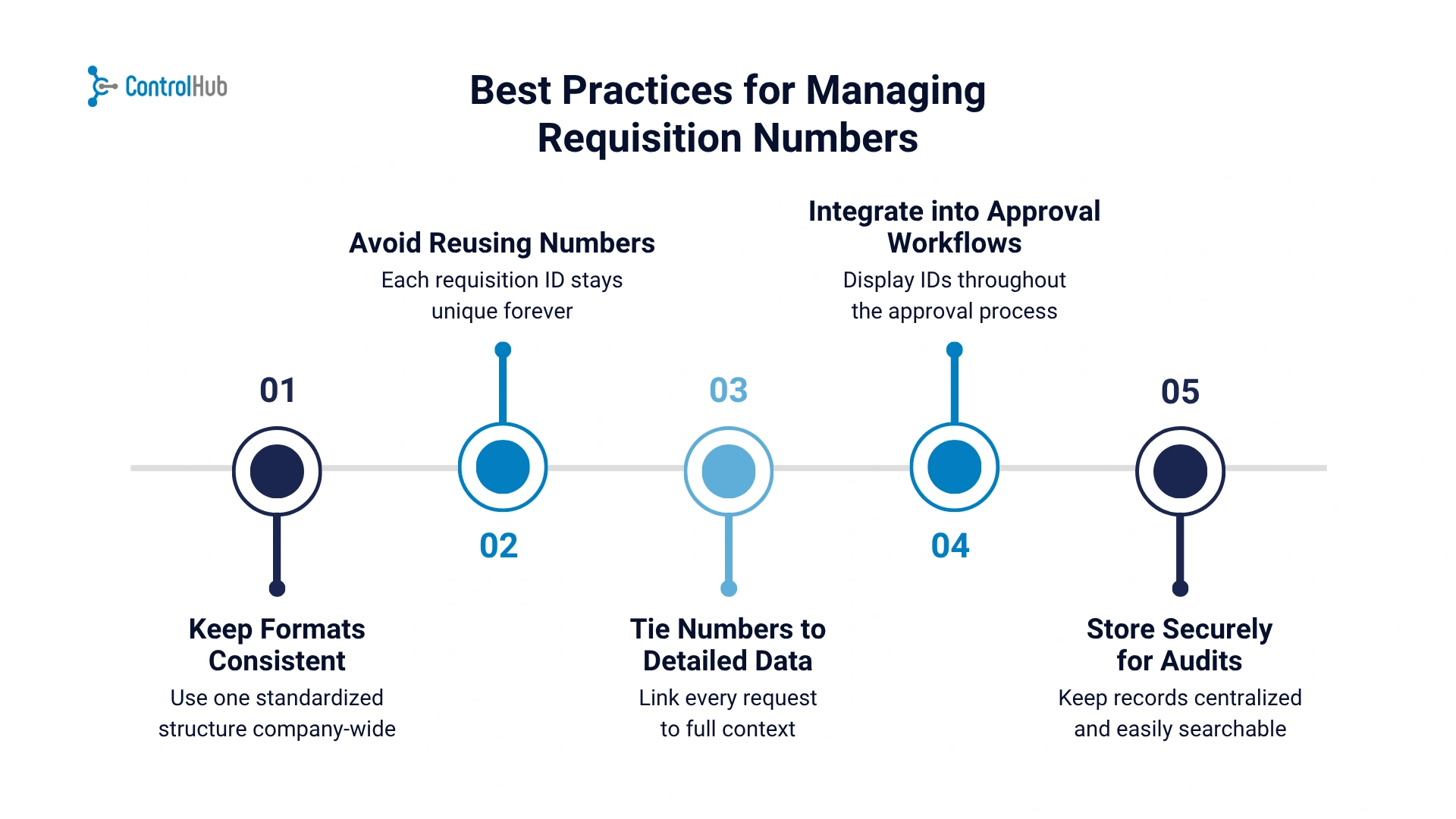 Treat requisition numbers like purchase order numbers or invoice IDs; they’re unique identifiers that help you track the full history of every request accurately.